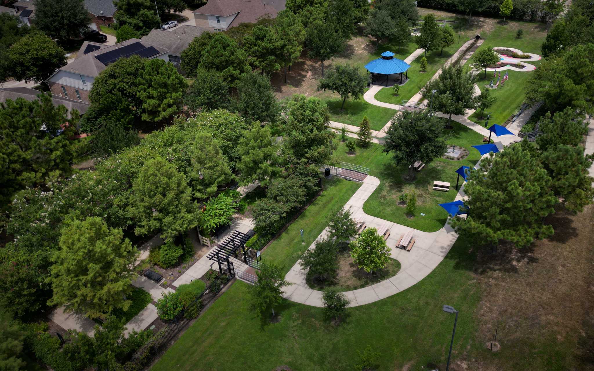 Located on Misty Cove Drive next to McRoberts Elementary School, the park offers a gazebo, amphitheater, butterfly area, statues, an outdoor “stump classroom,” walking paths, a wheelchair accessible ramp and a sensory garden. Statues, a windchime and other decor are made from materials that can withstand water in the event that a severe storm occurs and the drainage pond is used for water storage during and after storms.